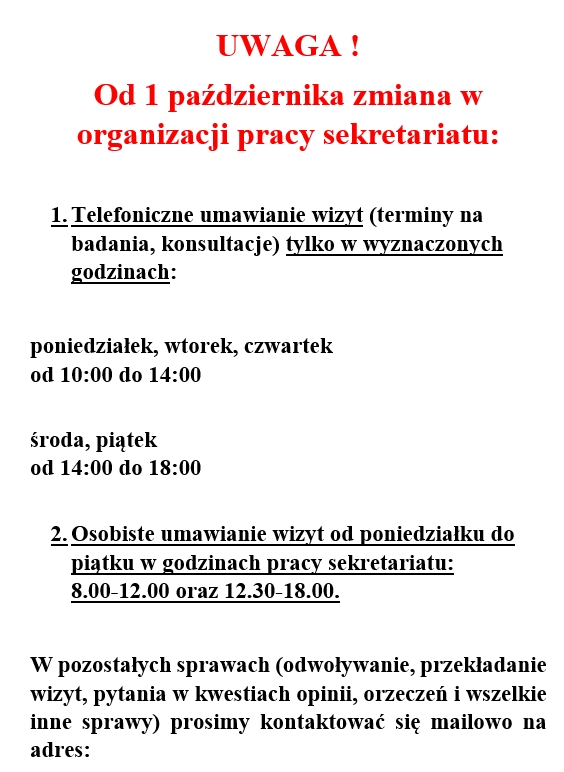 Sekretariat Poradni będzie czynny w następujących godzinach: