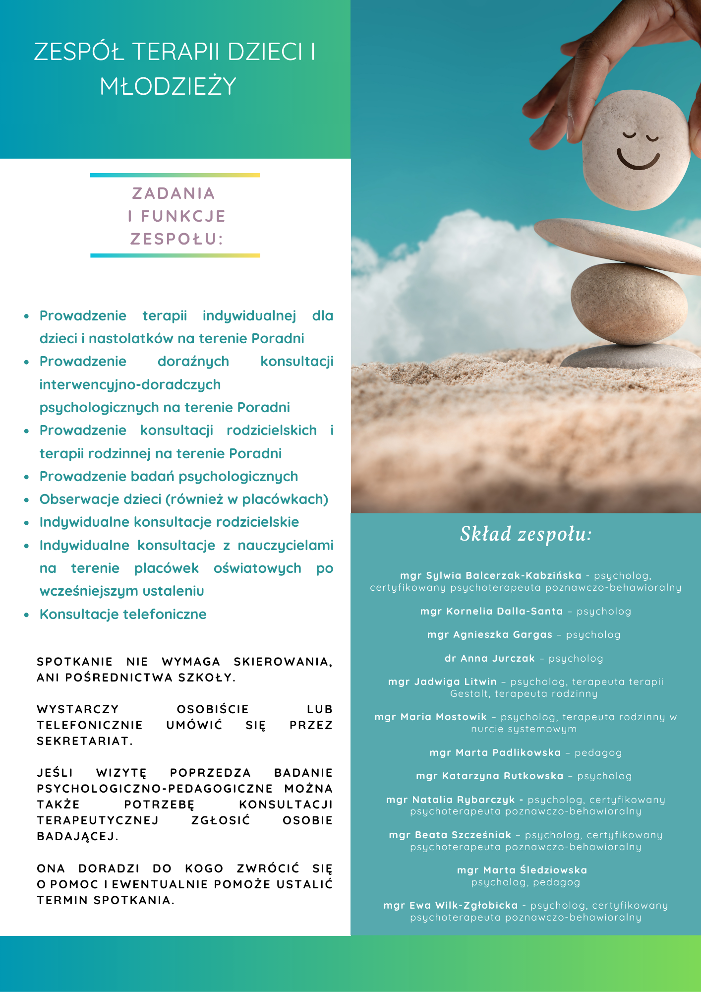 WszystkieZespoły Zespół pierwszego kontaktu Zespół Diagnozy i Wsparcia Psychologicznego Zespół biofeedback Zespół Wczesnej Pomocy Psychologiczno-Pedagogicznej Zespół Logopedyczny Zespół Terapii Pedagogicznej Zespół Terapii Dzieci, Młodzieży i Rodzin Zespół Orientacji i Poradnictwa Zawodowego